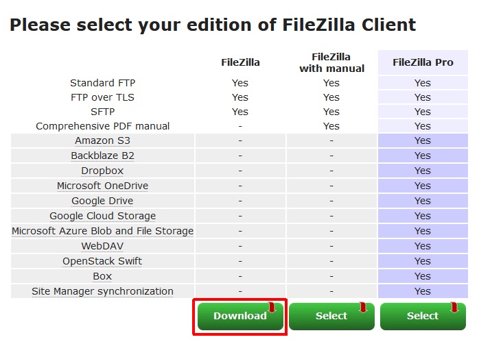 Įėję į FileZilla puslapį rinkitės mygtuką "Download FileZilla Client", tada iššokusiame lange mygtuką "Download" stulpelyje FileZilla.